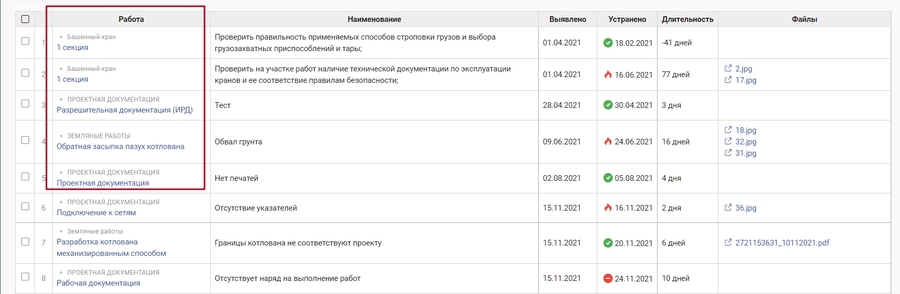 Столбец "Работа" отображает наименование группы (подгруппы) и работы, по которой выдано предписание.