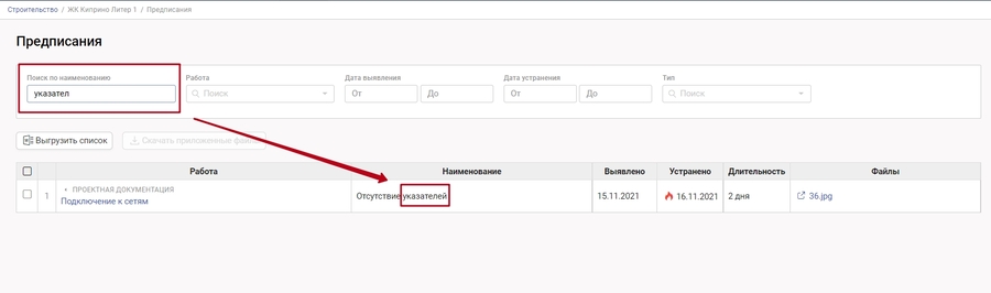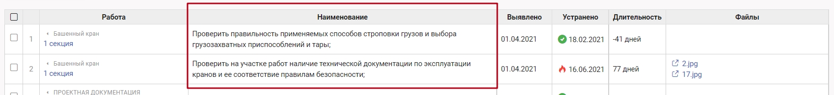 Столбец "Наименование" содержит наименование предписания, которое указал стройконтроль при выдаче предписания.