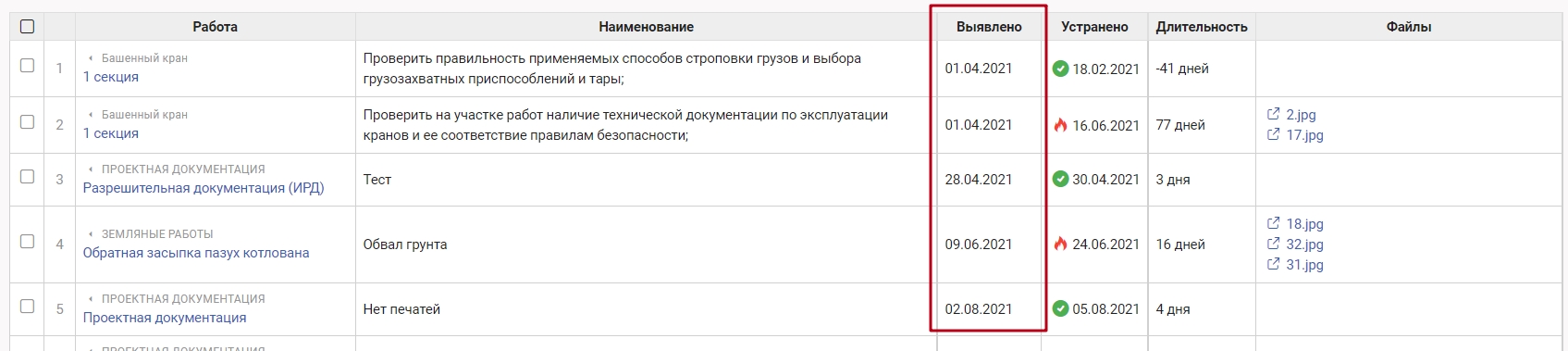 Столбец "Выявлено" - дата фиксации предписания, присваивается системой автоматически в день внесения предписания стройконтролем.
