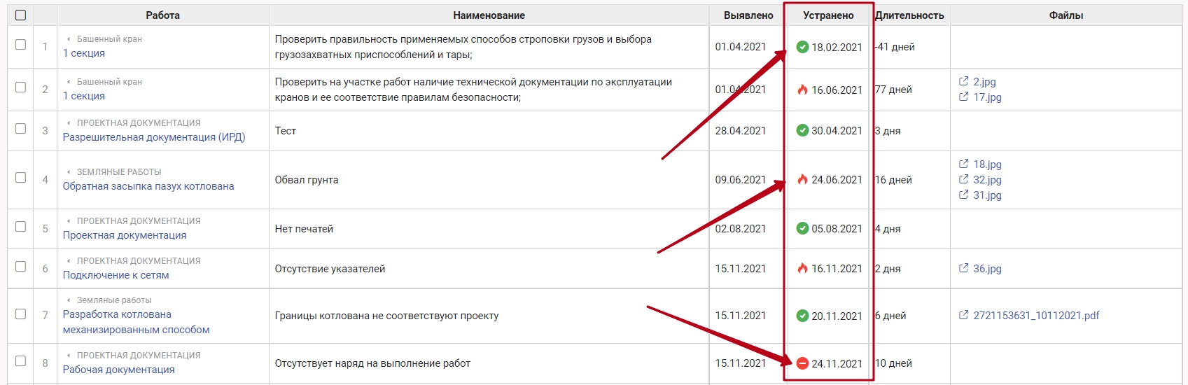 Для удобства использования отчета в столбце "Устранено" применяются дополнительные символы:
