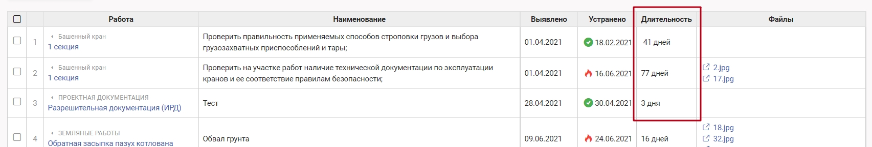 Столбец "Длительность" - разница между плановой датой устранения и датой выявления предписания