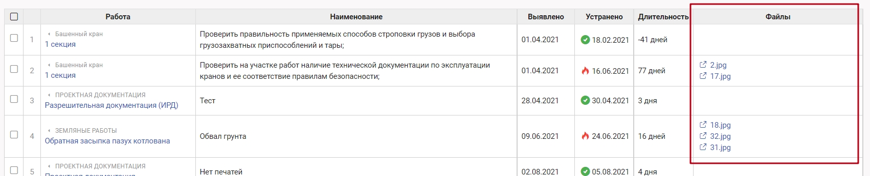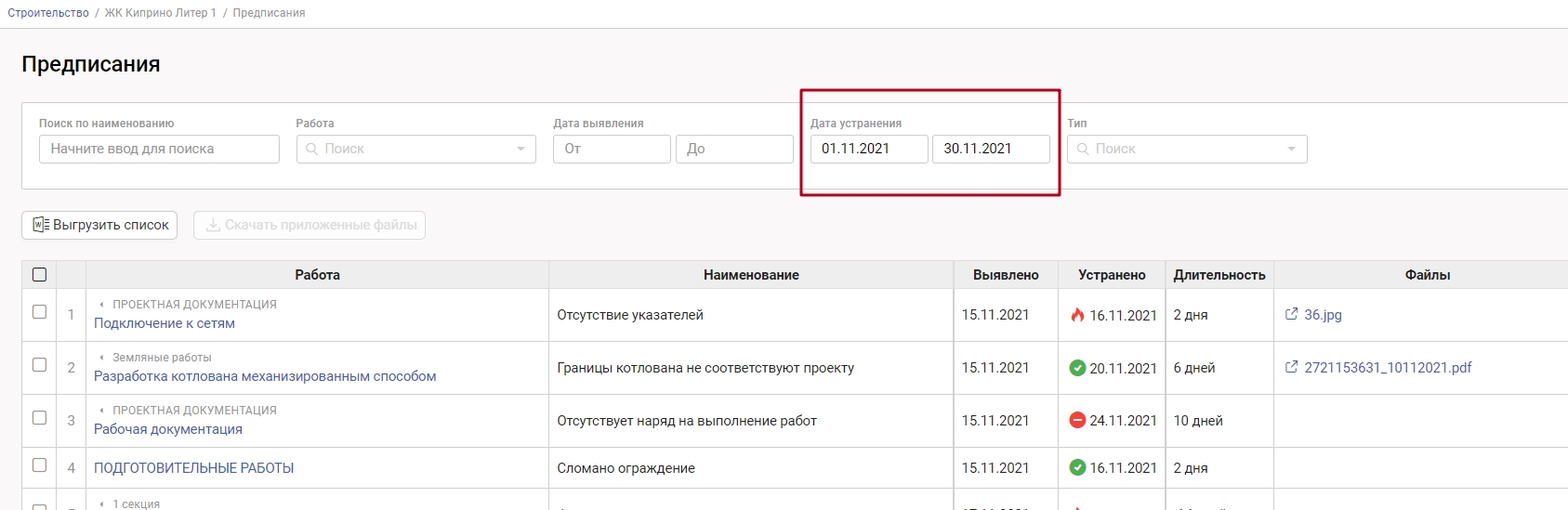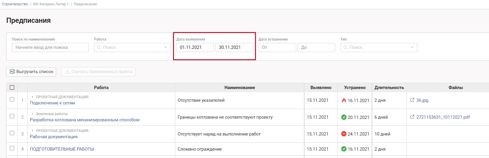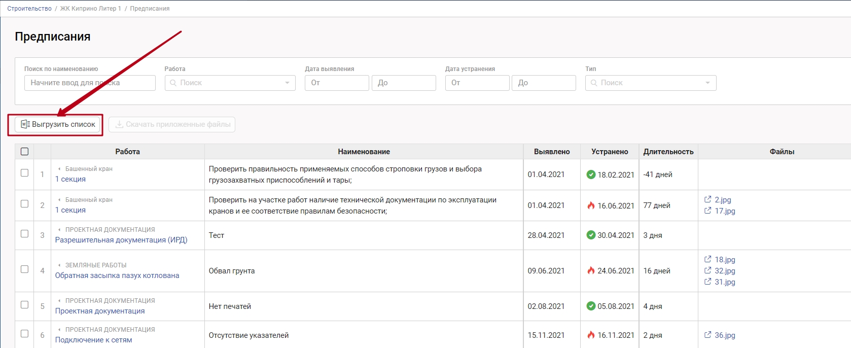 Столбец "Файлы" - все документы, прикрепленные стройконтролем к предписаниям