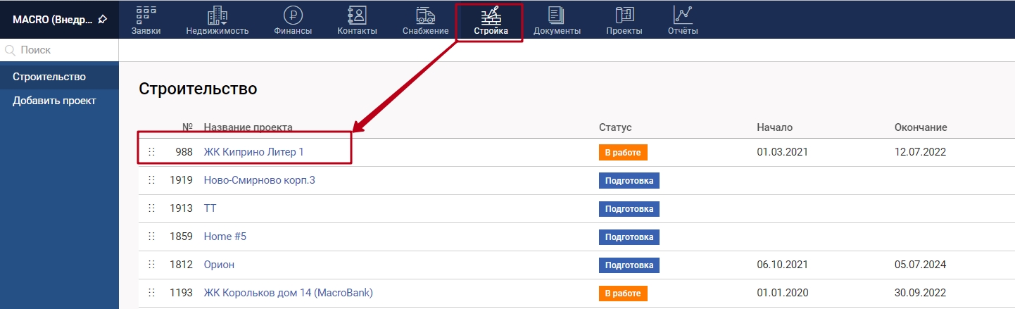 1. Откройте модуль "Стройка" и выберите интересующий проект.