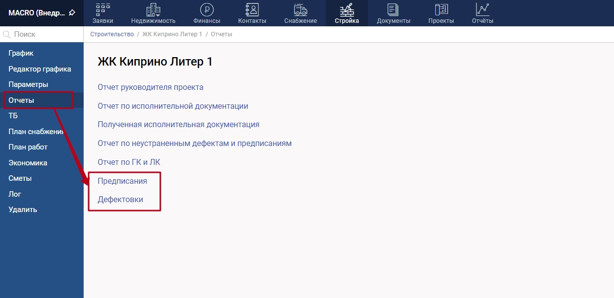 2. Нажмите раздел "Отчеты", выберите "Предписания" или "Дефектовки".