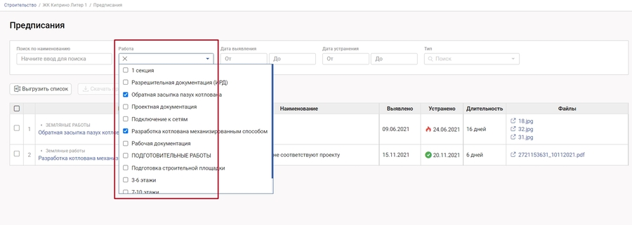 "Работа" позволяет выбрать из списка работы, и отфильтровать предписания только по выбранным работам. Если работа не указана в выпадающем списке - значит на нее нет предписаний.