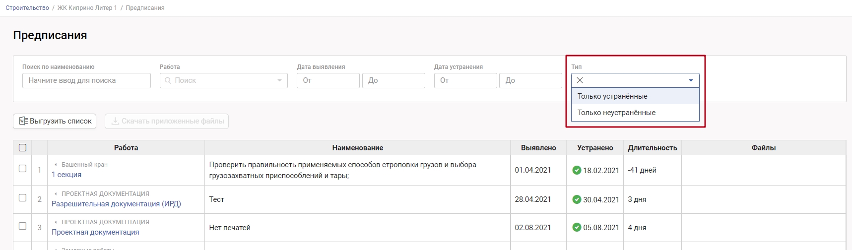 "Тип" позволяет выбрать среди всех предписаний только устраненные или только неустраненные