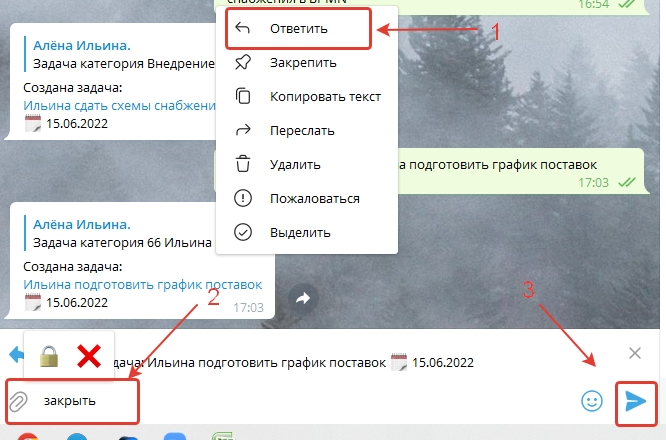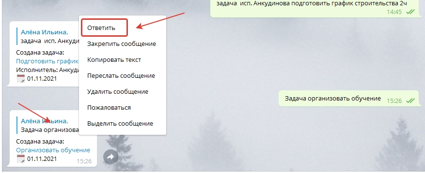 1. Нажмите правой кнопкой мыши на сообщение от бота и выберите Ответить