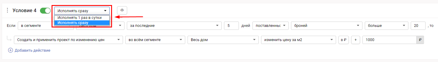 А что случится при исполнении такого же условия сразу? При первой же постановке брони робот проверит выполнение условия: 1 поставленная бронь равна 1 брони в условии, значит условие сработало. Робот тут же приступит к выполнению действий - отправит оповещение и поднимет стоимость объектов во всем доме на 100 000 руб. Если менеджеры поставят еще одну бронь, робот снова выполнит проверку: 2 поставленных брони - это больше 1 брони в условии, следовательно, условие снова выполнено, запускаем действия. Значит стоимость объектов снова поднимется на 100 000 руб. Итого к концу дня, если за день в доме было поставлено 5 броней, мы получим 5 уведомлений и 5 примененных проектов переоценки, каждый из которых поднимет стоимость объектов в доме на 100 000 руб.