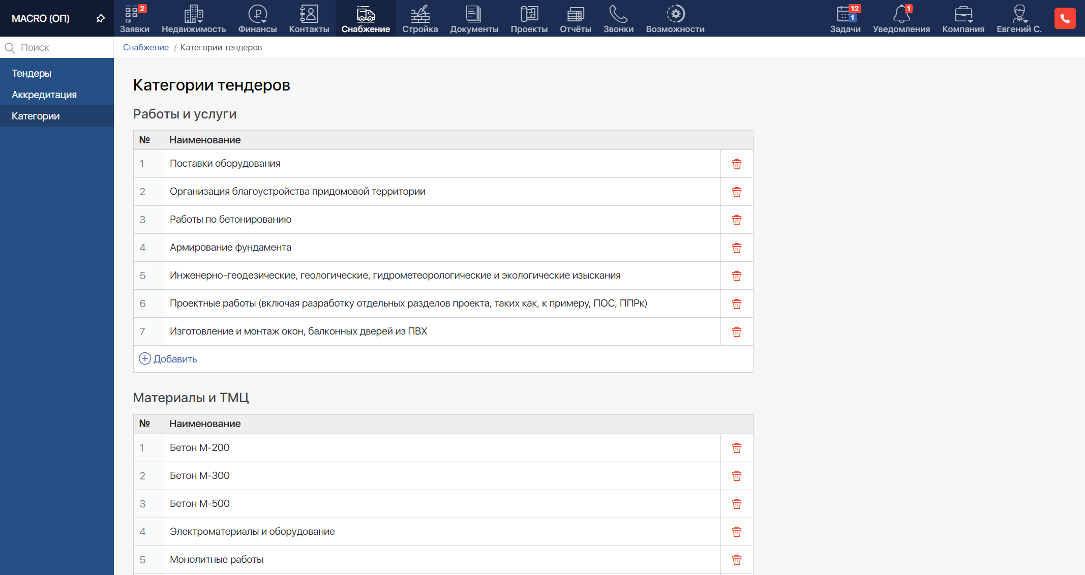 Категории тендеров задаются отдельно от номенклатуры снабжения в специальном интерфейсе на странице «Категории» внутри тендеров.