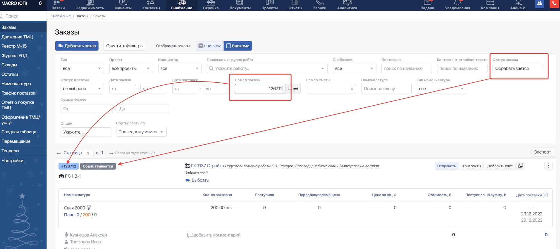 2. Создайте заказ на поставку ТМЦ (подробнее в инструкции) и доведите его до стадии «Обрабатывается». Или выберите заказ в статусе «Обрабатывается», отфильтровав список всех заказов.