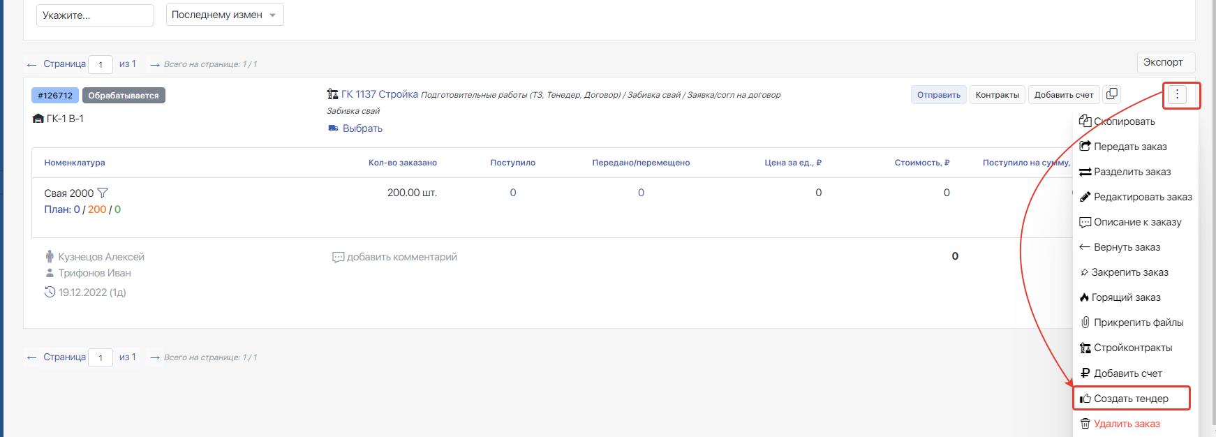 3. Нажмите на меню заказа и выберите в выпадающем списке «Создать тендер»