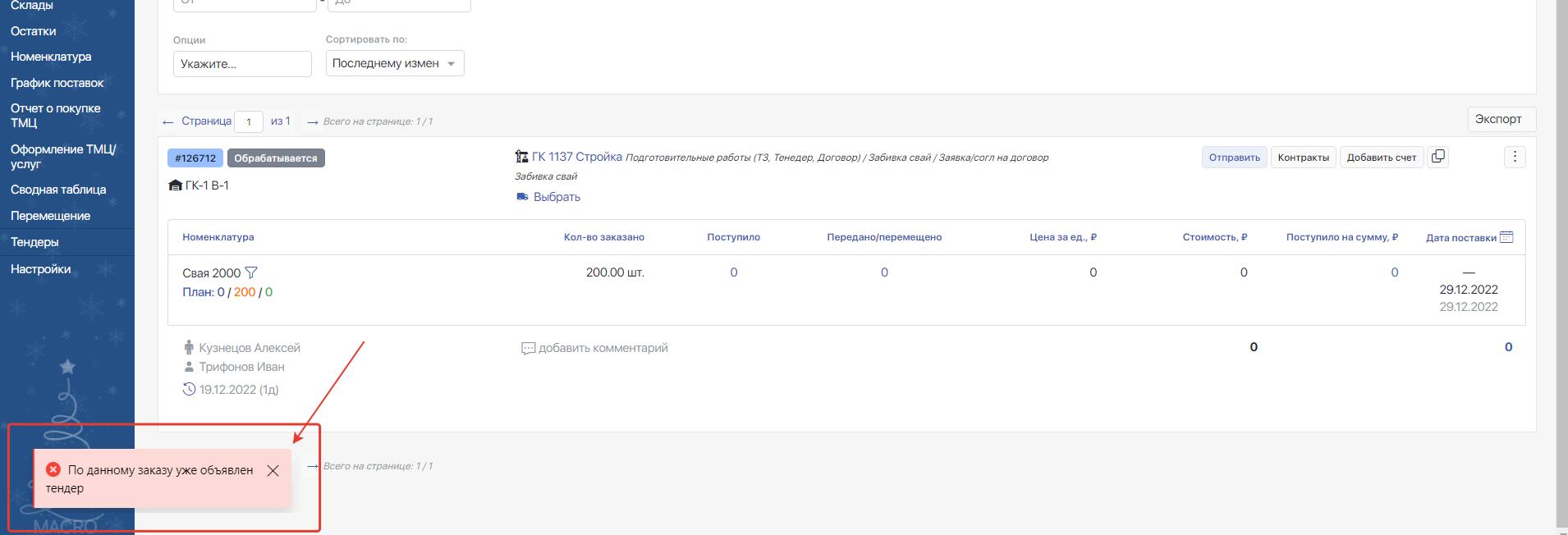 Если по данному заказу ранее создавался тендер, то система выдаст ошибку «По данному заказу уже объявлен тендер»