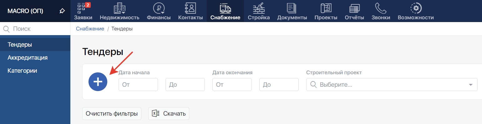 Конкретный тендер создаётся кликом по кнопке + в листинге тендеров или по кнопке Создать тендер в заказе снабжения (в таком случае тендер связывается с этим заказом).