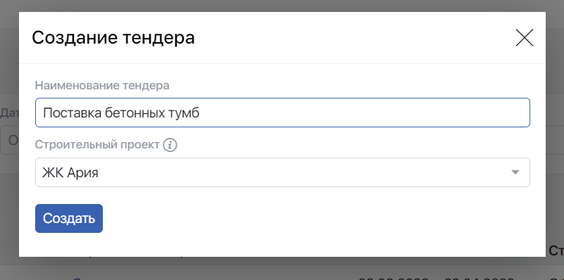 Обязательными параметрами при создании тендера являются название тендера и строительный проект, к которому тендер относится.