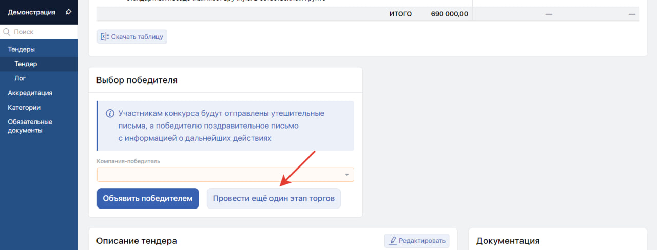 Чтобы провести ещё один этап торгов нажмите соответствующую кнопку у тендера в статусе «Выбор победителя».