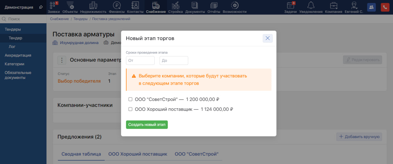 В модальном окне укажите сроки проведения и участников этапа, выбрав компании из числа подавших предложения на предыдущем этапе. После нажатия кнопки «Создать новый этап» текущий тендер будет полностью скопирован и ему будет установлен признак «Закрытый».
