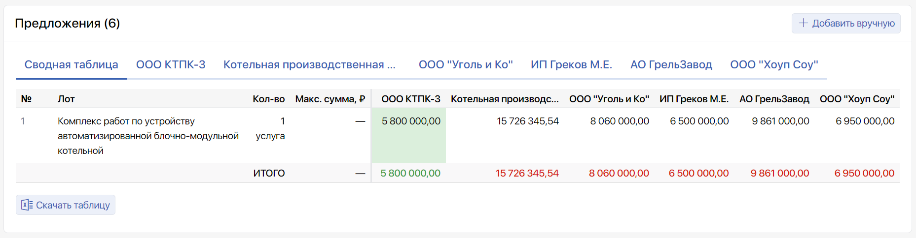 Можно посмотреть и скачать предложение конкретного контрагента, Также доступна для просмотра и скачивания доступна сводная таблица предложений.