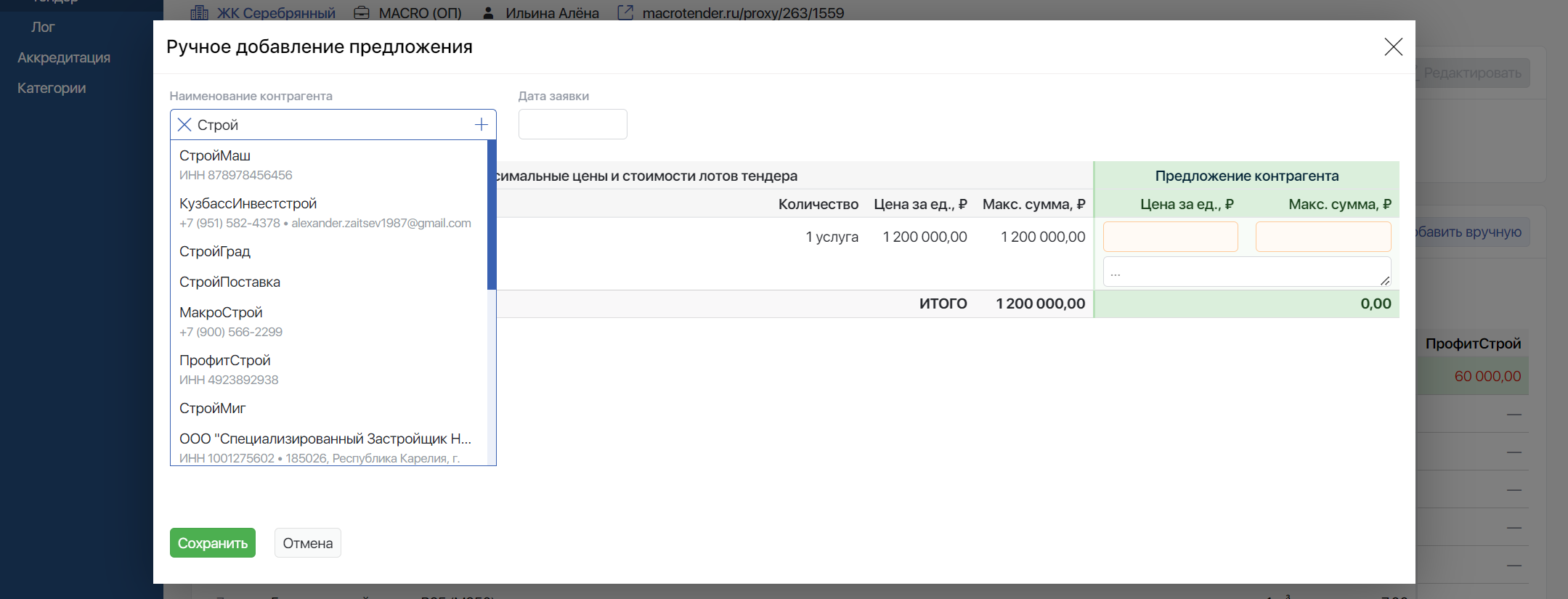 В случае, если предложение контрагента получено вне тендерной площадки (например, по почте), можно добавить его вручную:
