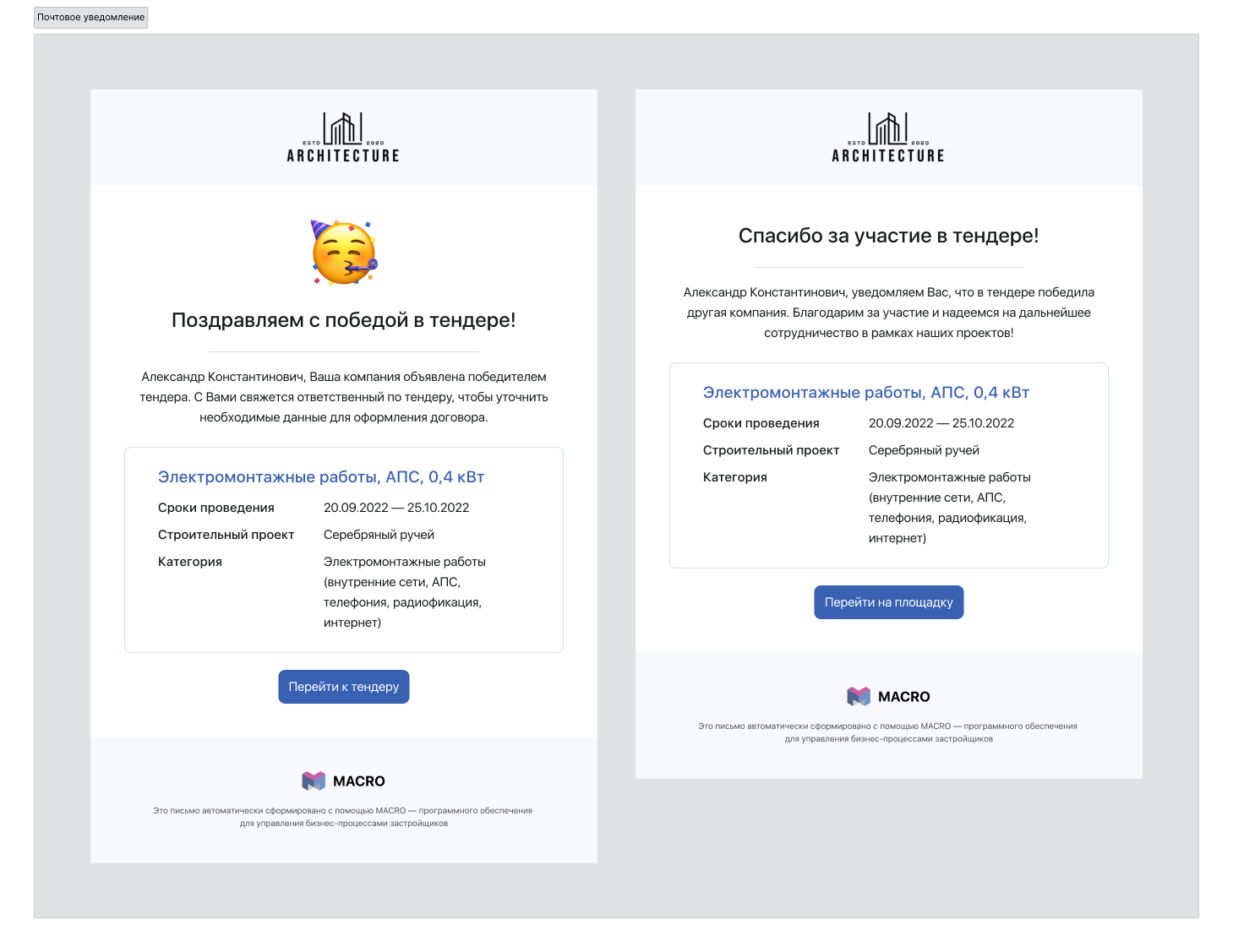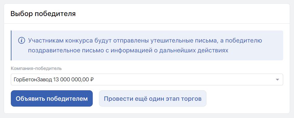 Ответственный за тендер выбирает компанию-победителя и нажимает кнопку «Объявить победителя» — после этого статус тендера меняется на «Завершён», победителю уходит поздравительное письмо, а всем участникам утешительные письма.