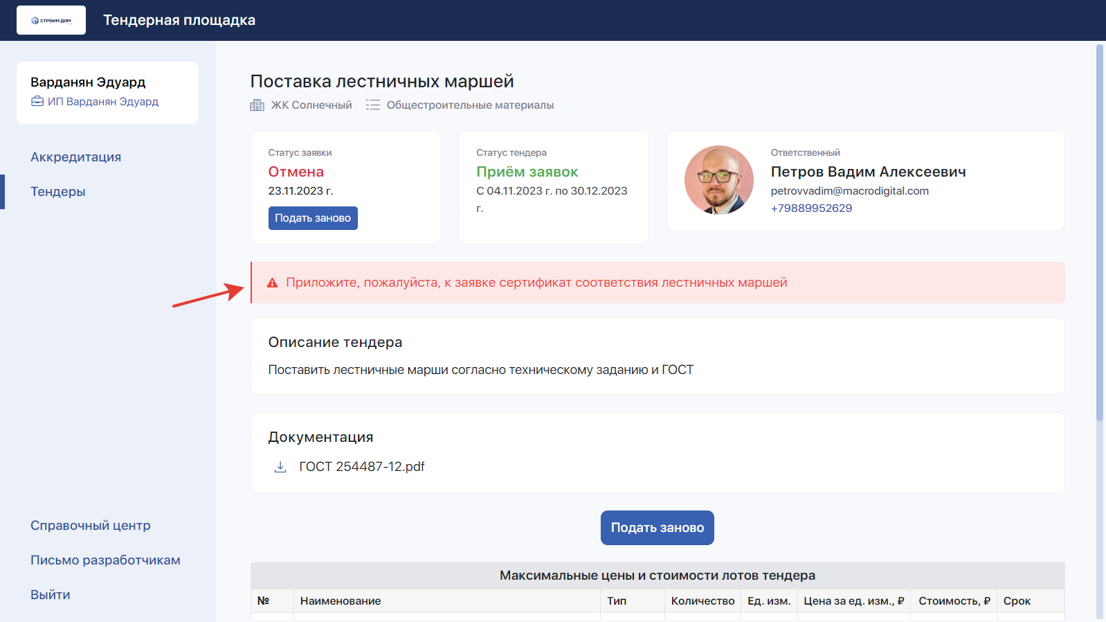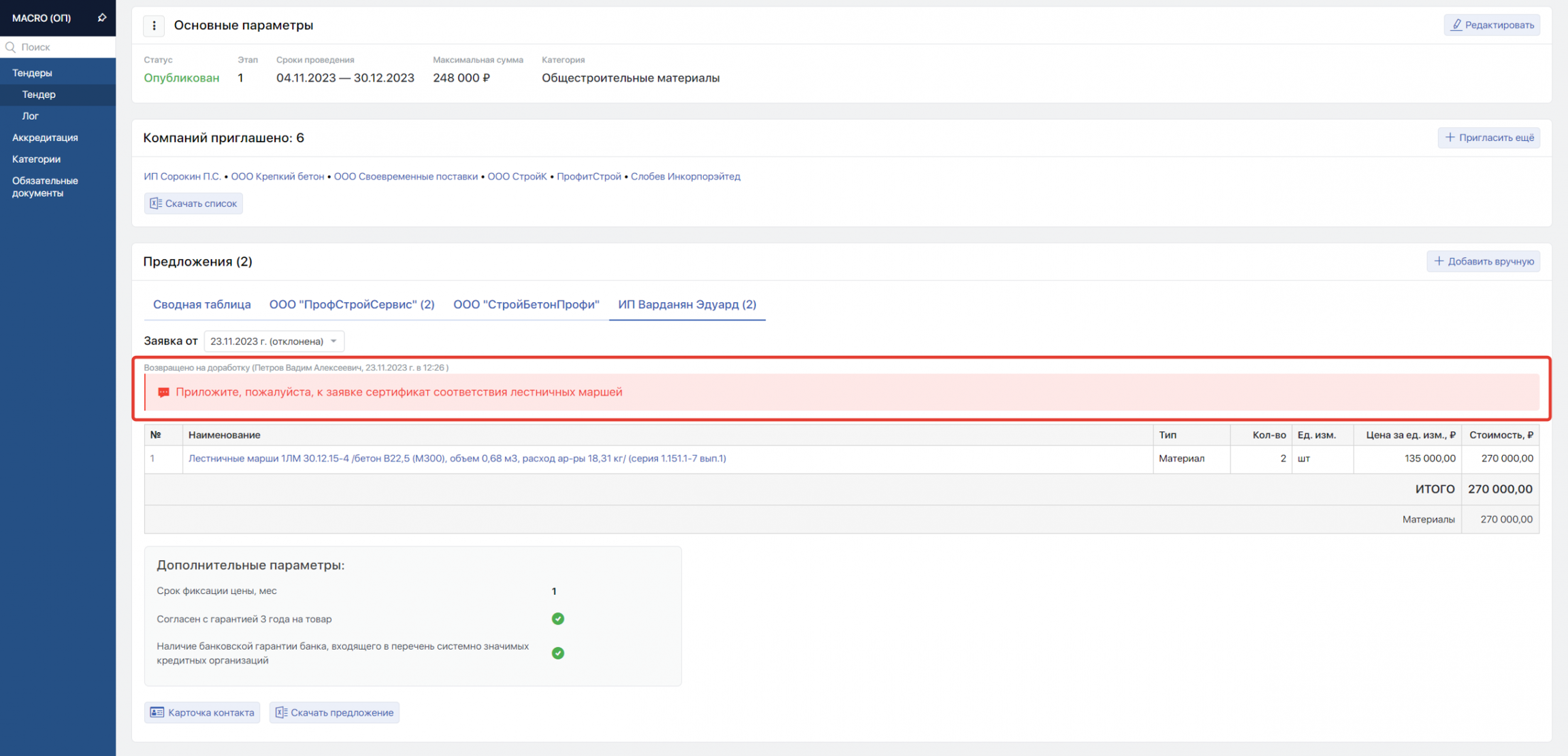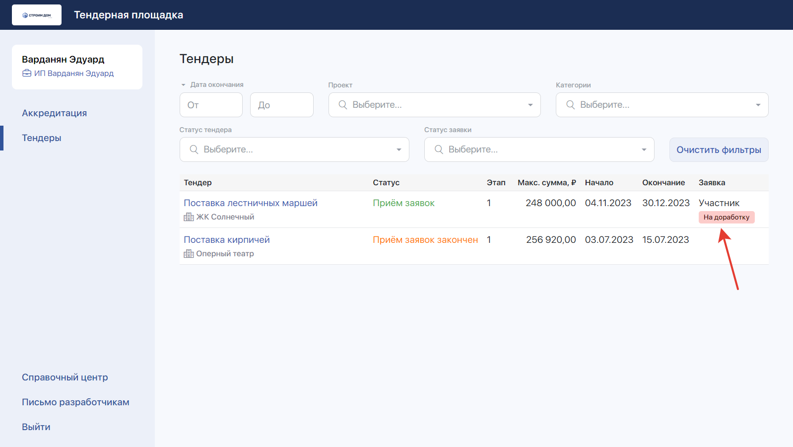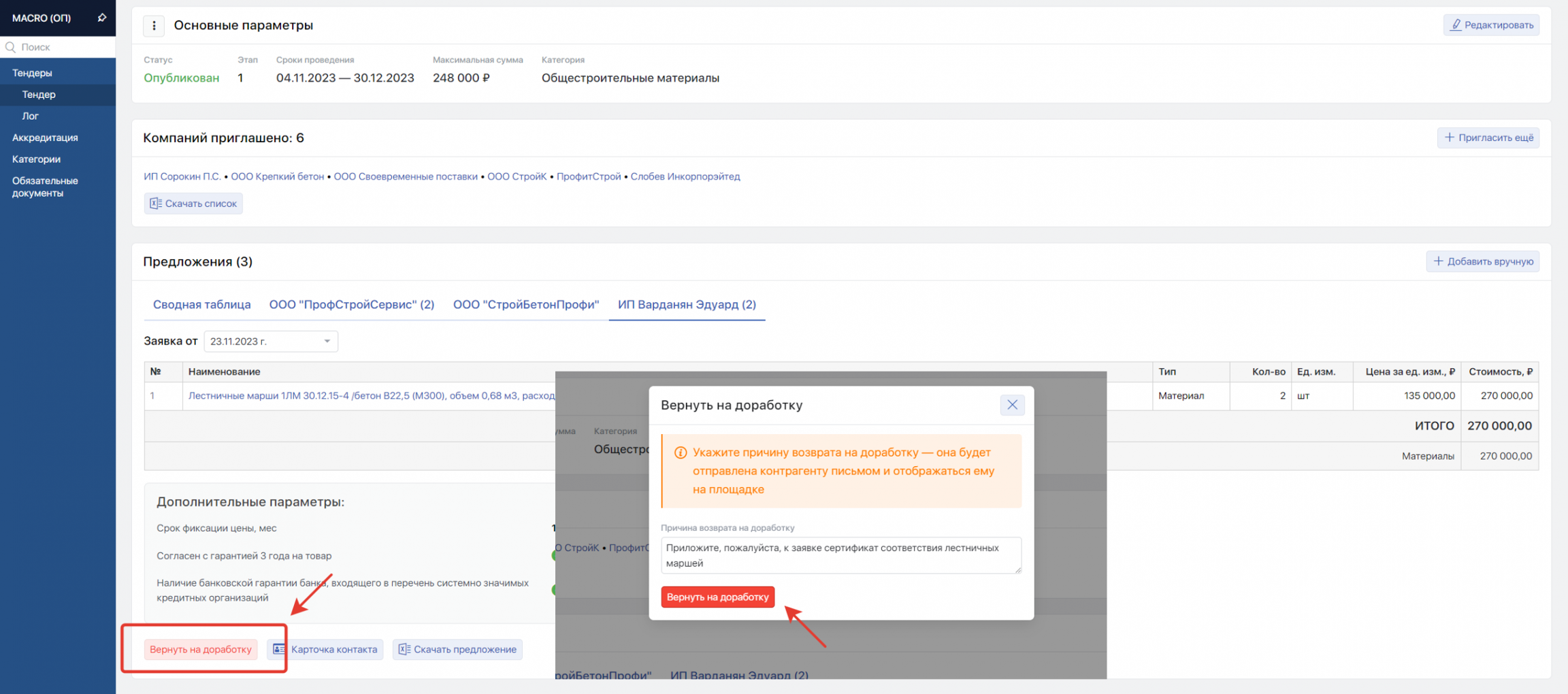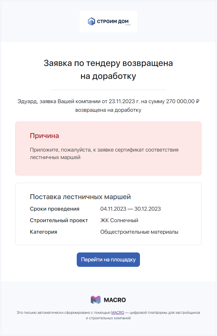 Причина возврата на доработку будет отображаться контрагенту на тендерной площадке. После внесения правок подрядчик или поставщик сможет заново отправить уточнённое коммерческое предложение.