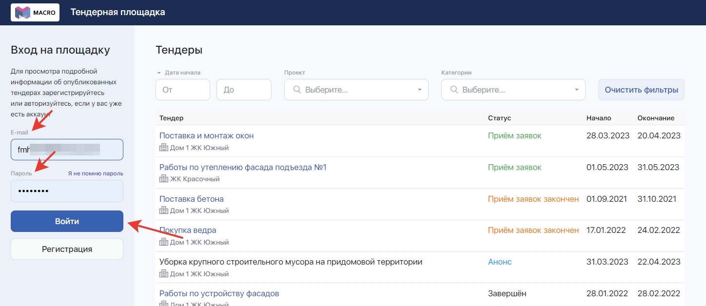 Для участия в тендерах необходимо пройти аккредитацию застройщика. После успешной аккредитации Вы будете получать по emailil уведомления о появлении на площадке новых тендеров аккредитованных категорий, а также получите возможность подачи заявок на участие в тендерах.