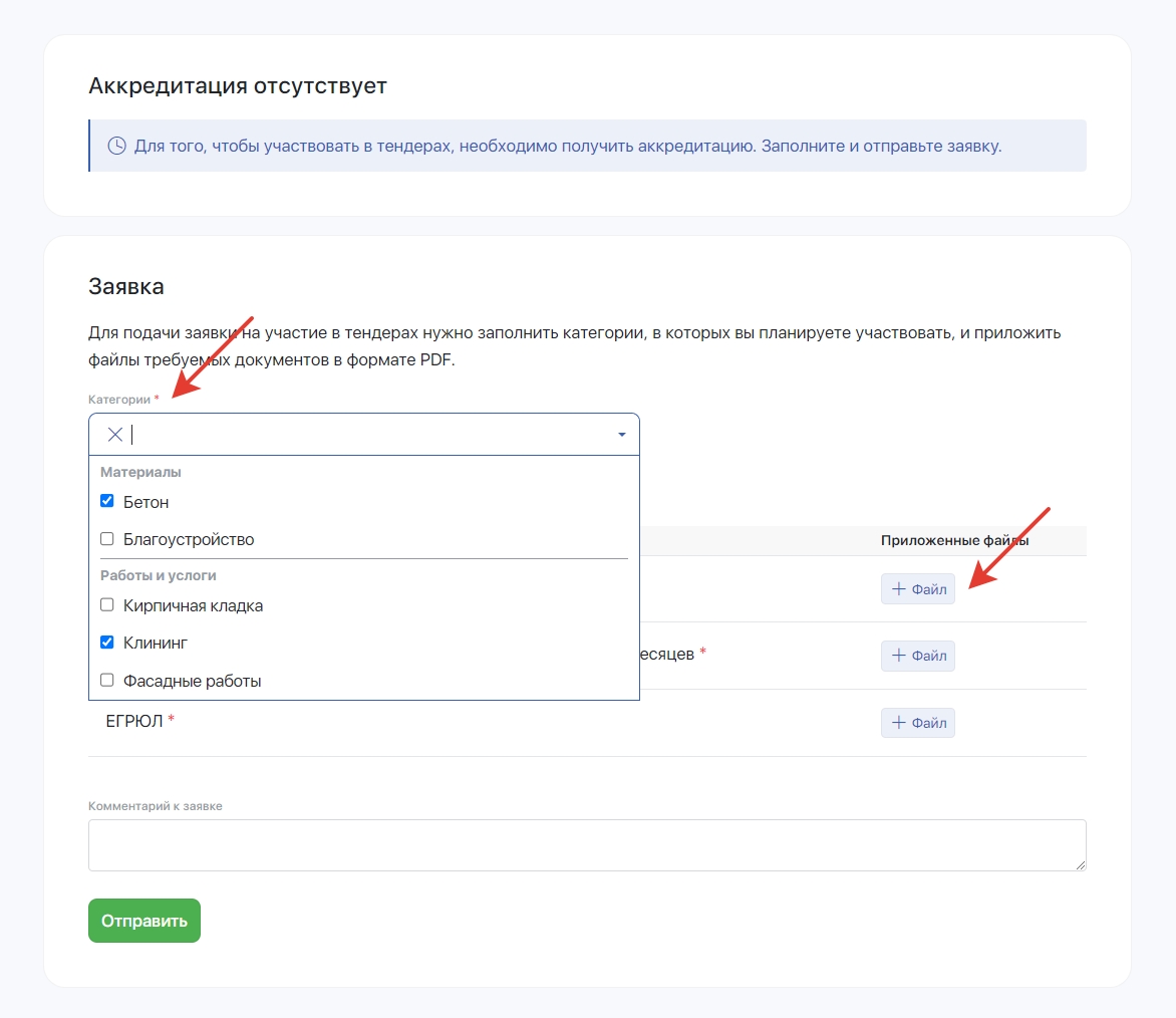 3. Выберите категории, в которых будете проходить аккредитацию. Категории служат для фильтрации автоматической рассылки о новых тендерах. Например, если Вы выберите категории «Бетон» и «Клининг», то оповещение о появлении тендера в категории «Кирпичная кладка» Вы уже не получите.