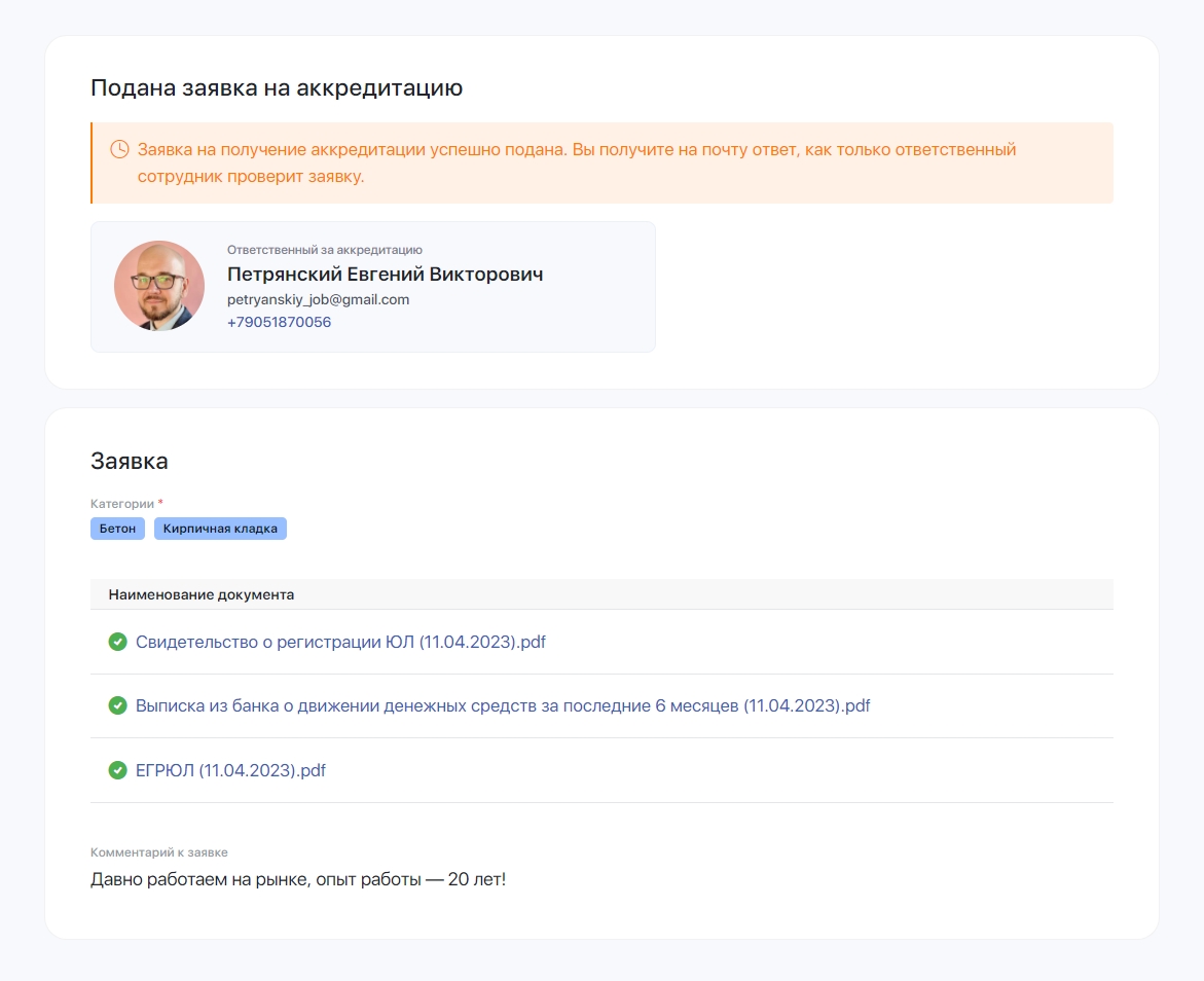 После отправки заявки ожидайте проверки заявки ответственным сотрудником. Контактные данные сотрудника вы увидите на экране — если заявка проверяется долго, то самостоятельно свяжитесь с ним.