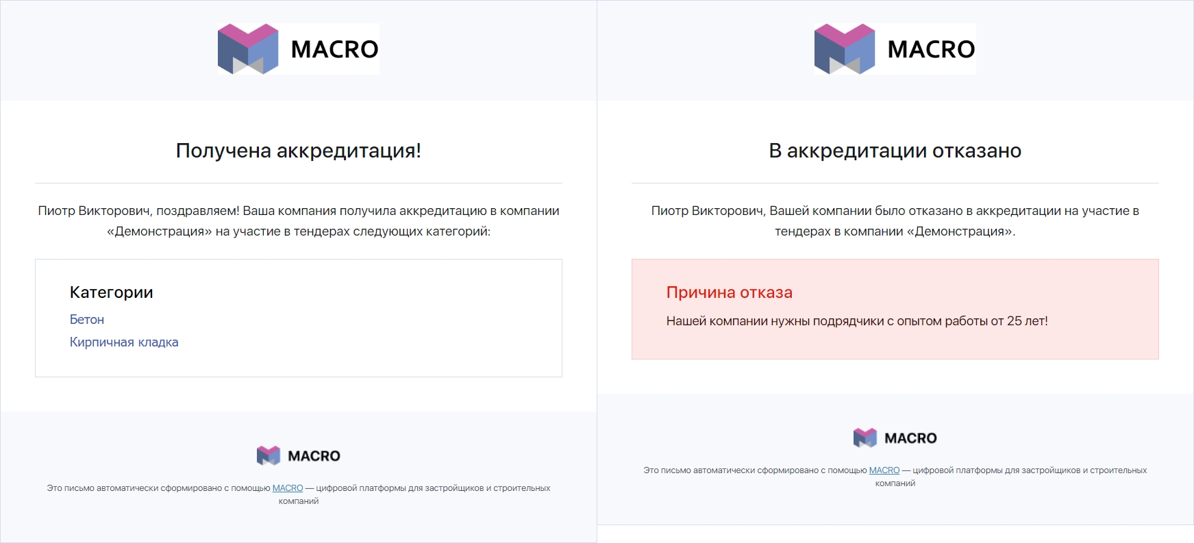 В случае отказа — причину отказа. Устранив причину, Вы сможете повторно подать заявку на аккредитацию.