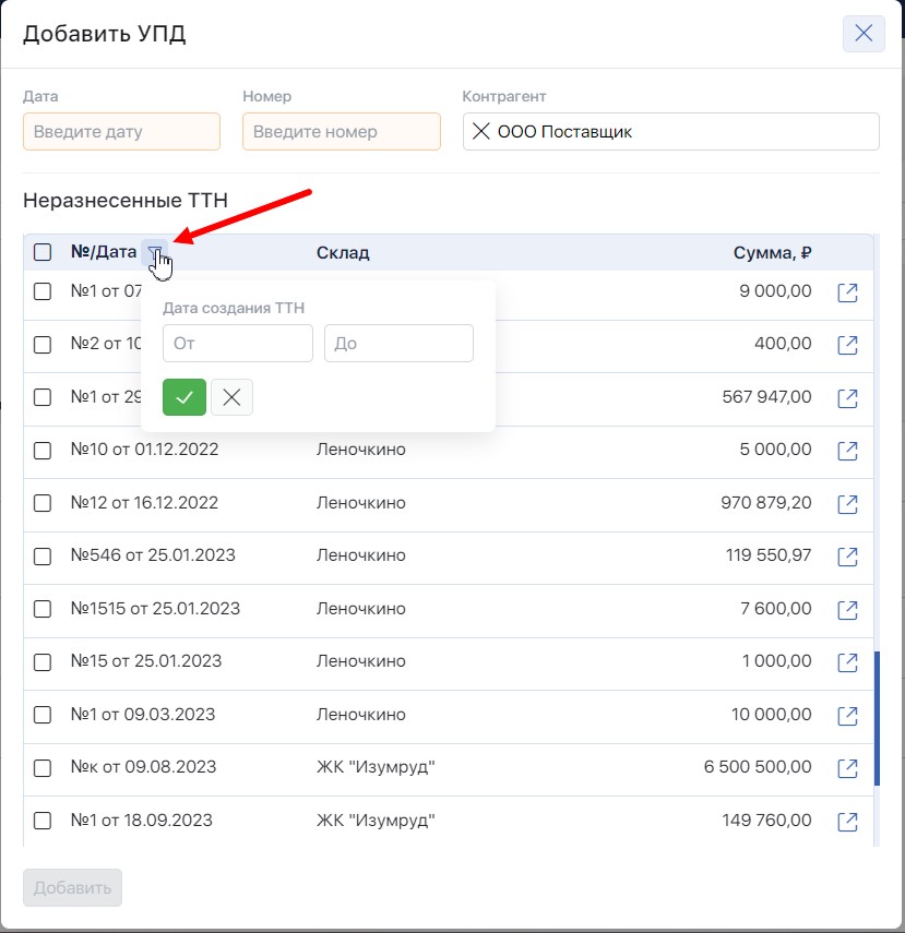 Также было обновлено модальное окно по созданию УПД. Мы не только внесли изменения в внешний вид, но и добавили возможность сортировки по дате ТТН, для упрощения поиска.