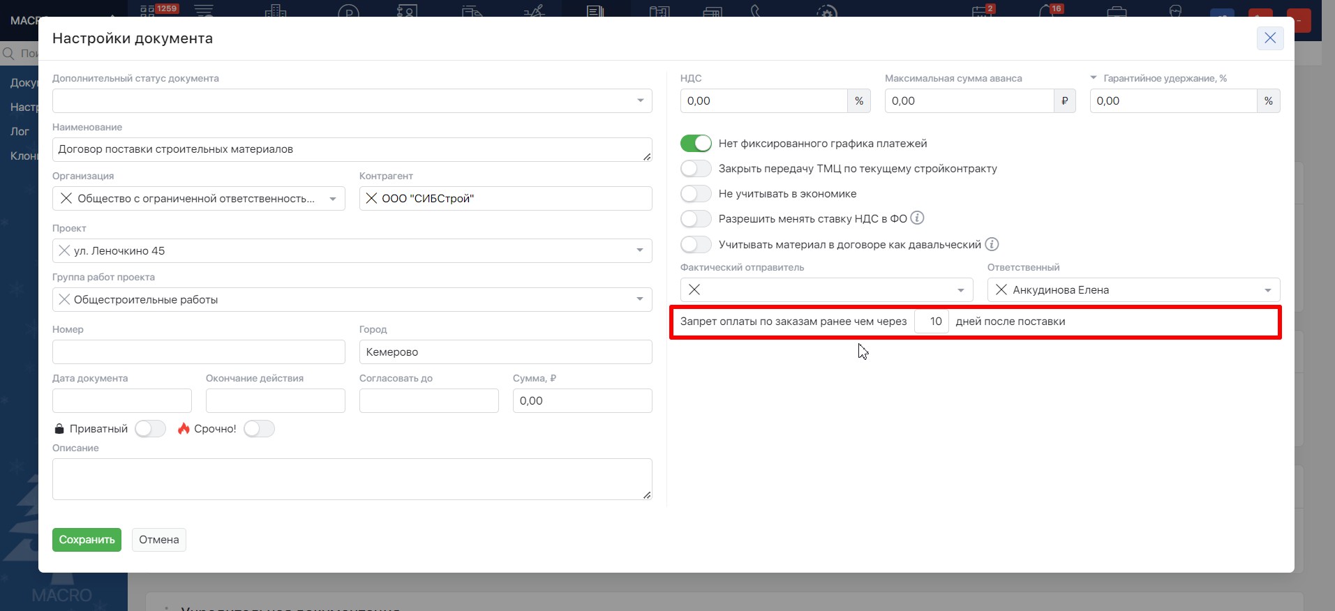 При указании в параметрах проекта нужного Вам количества дней, система не разрешит создавать финансовые операции в заказах ранее указанного срока. Это позволит минимизировать ошибки при оплатах вне договоренностей с поставщиком.
