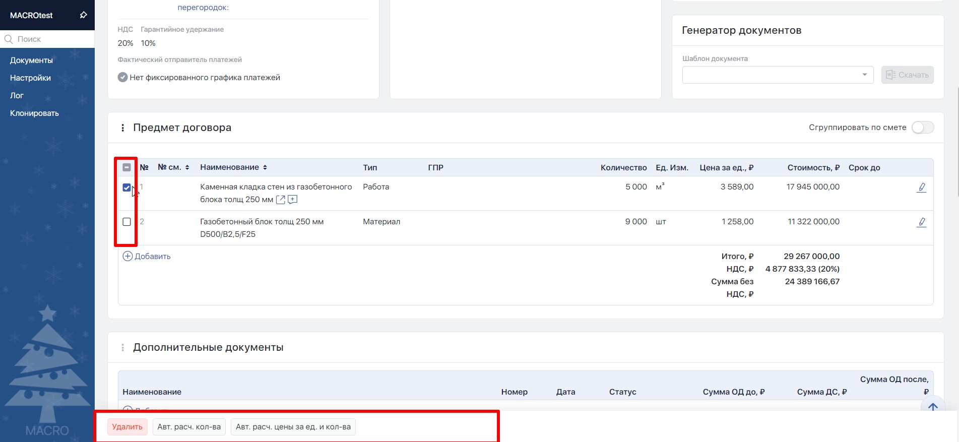 Меню массовых действий, которое появляется при выделении позиций в предмете договора, мы перенесли в нижнюю часть страницы, чтобы оно не перекрывало заголовки таблицы. Также мы добавили возможность включать масоова у позиций такие опции как:
