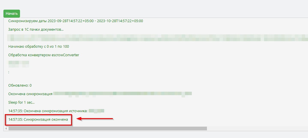 После запуска синхронизации не перезагружайте и не закрывайте текущую страницу, дождитесь окончания. Об этом будет сказано в логе: