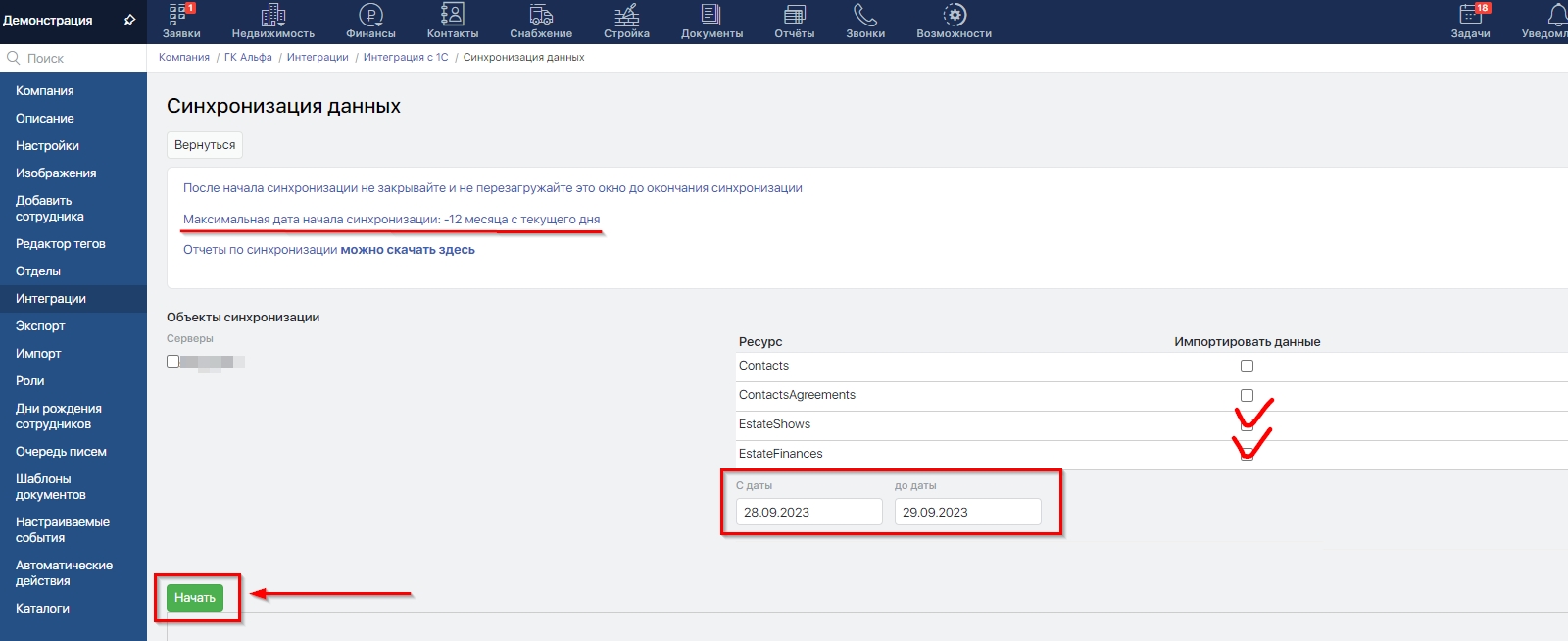 Отметьте галочками сущности, которые требуется синхронизировать, укажите дату начала синхронизации и нажмите кнопку Начать: