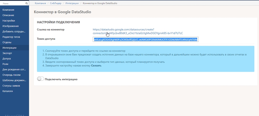 Скопируйте Токен доступа и перейдите по ссылке на коннектор
