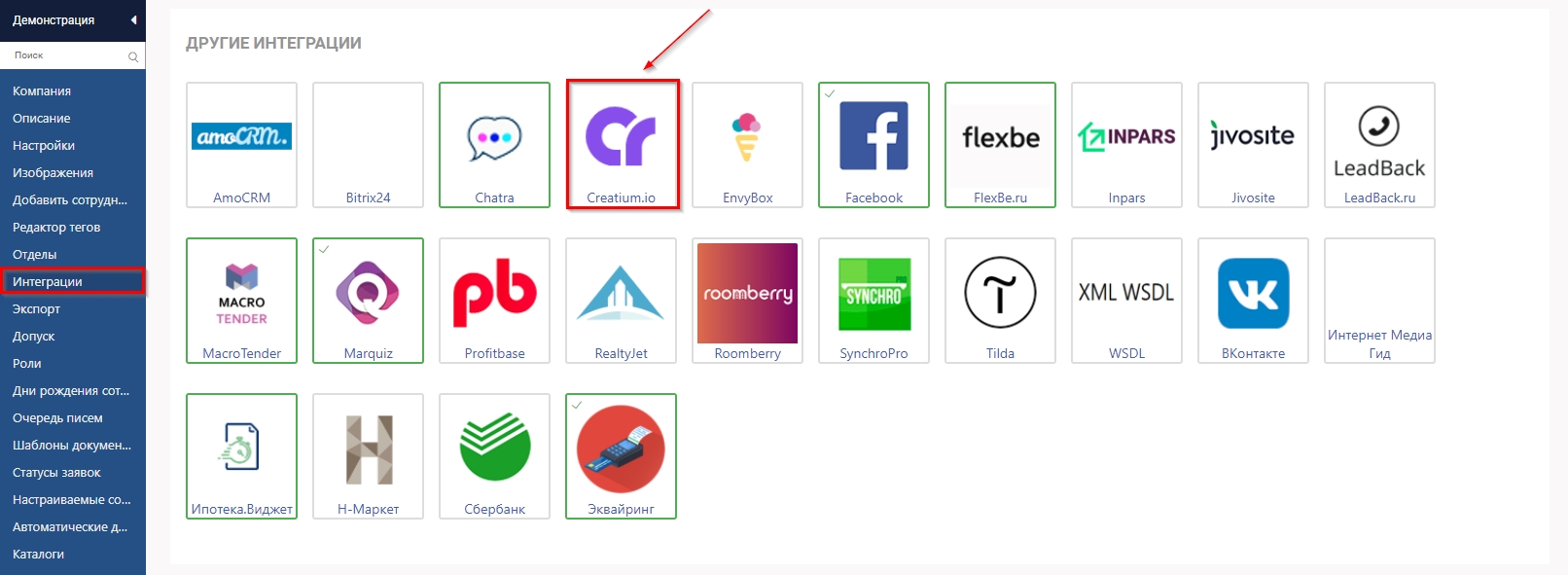 На странице интеграций в разделе Другие интеграции выберите Creatium.io