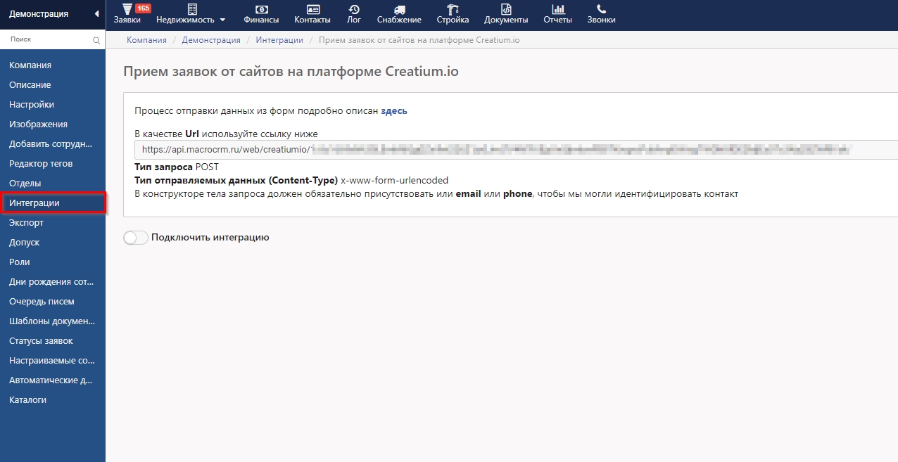 На странице интеграции следуйте инструкции для подключения приема заявок