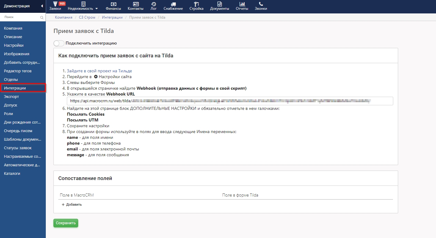 Для подключения интеграции с сайтом на платформе Tilda, перейдите в раздел Компания - Интеграции