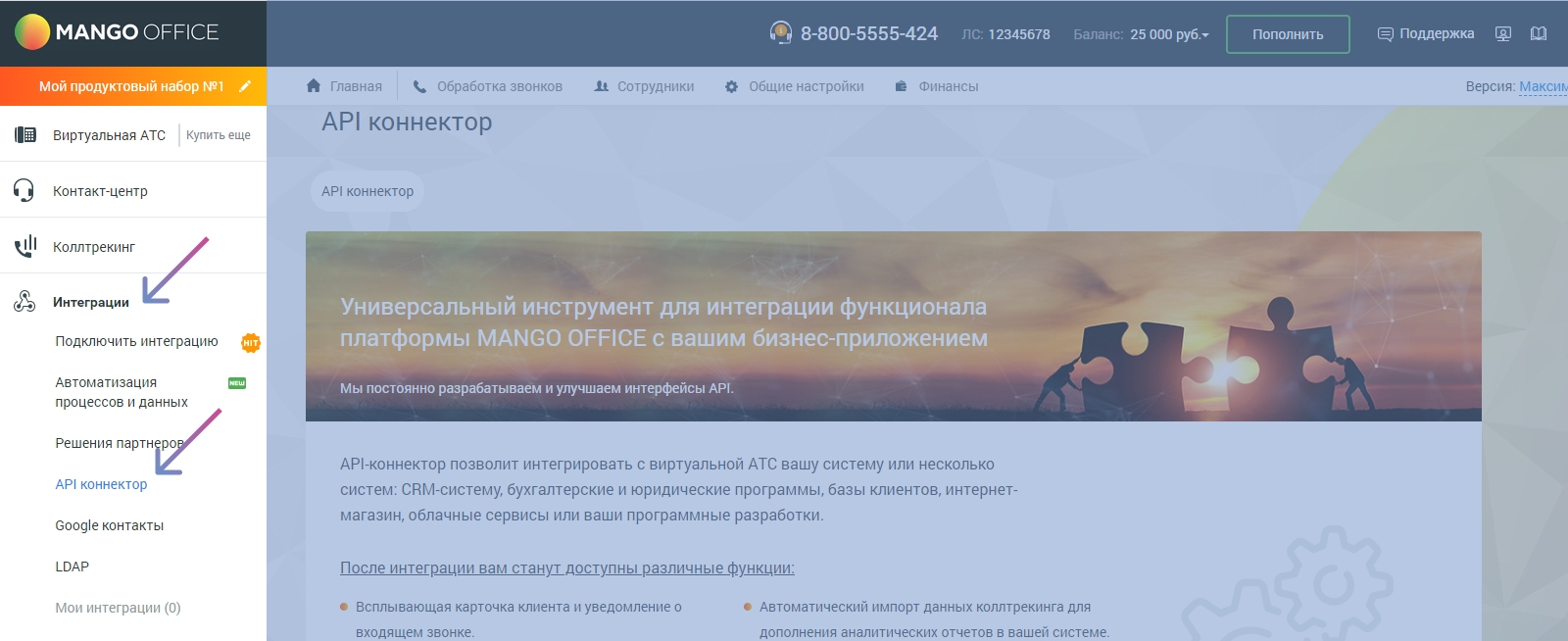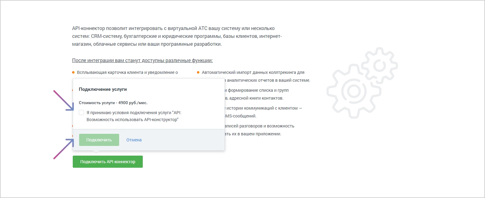 1. В личном кабинете виртуальной АТС необходимо перейти в раздел Интеграции - API Коннектор - Подключить API Коннектор
