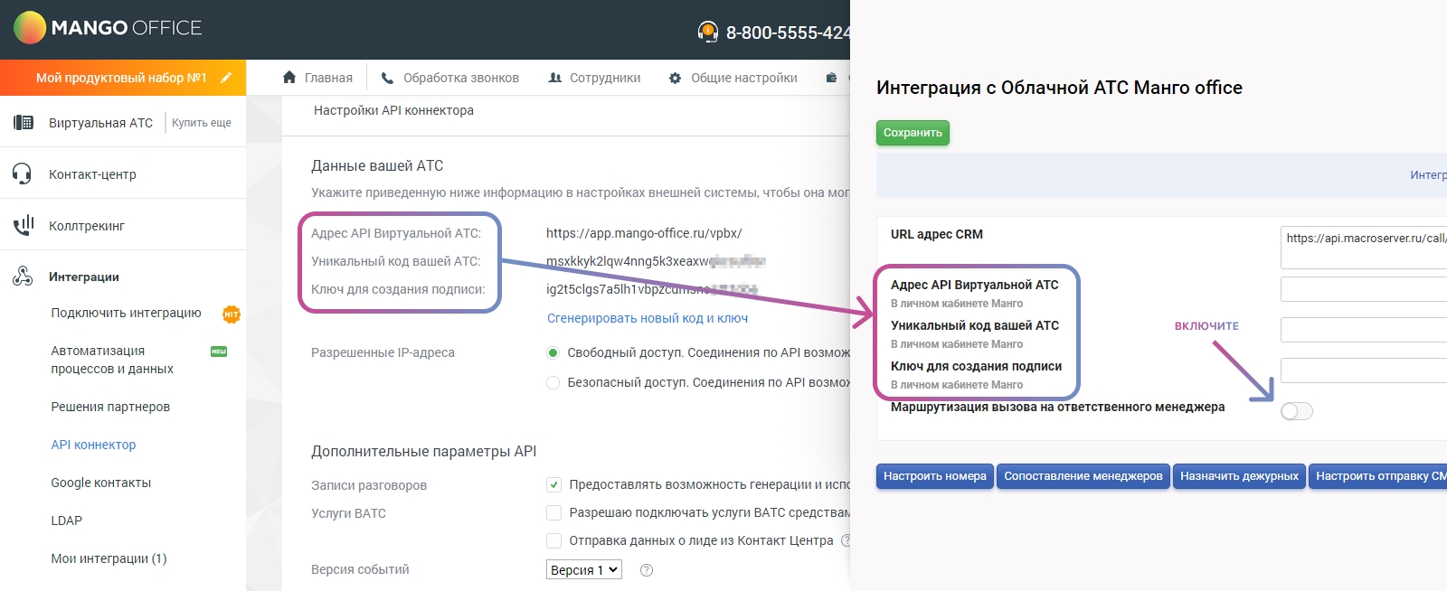 Скопируйте в настройках интеграции виртуальной АТС Адрес API Виртуальной АТС, Уникальный код вашей АТС и Ключ для создания подписи, и вставьте в одноименные поля в MacroCRM. Включите Маршрутизацию вызова на ответственного менеджера и сохраните настройки интеграции в MacroCRM