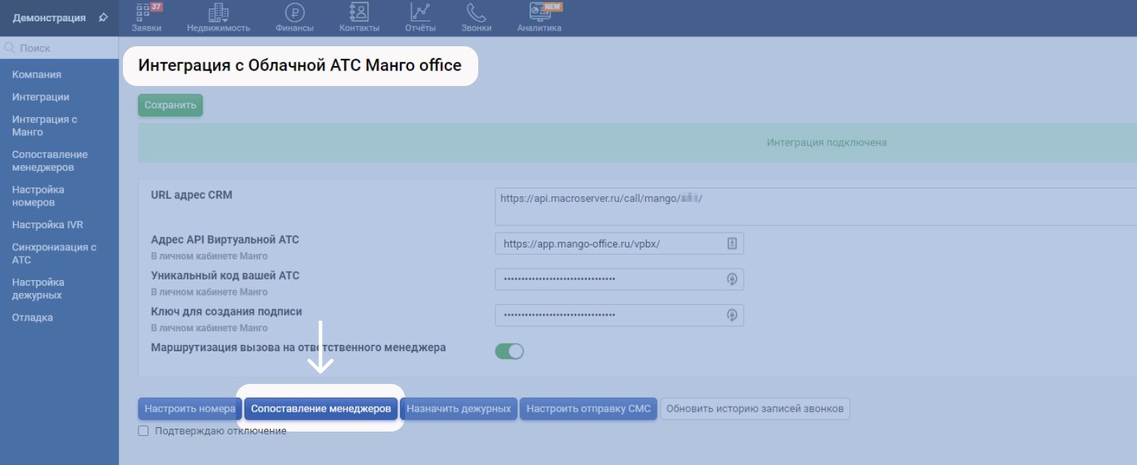 Для настройки сопоставления на странице интеграции в MacroCRM нажмите Сопоставление менеджеров: