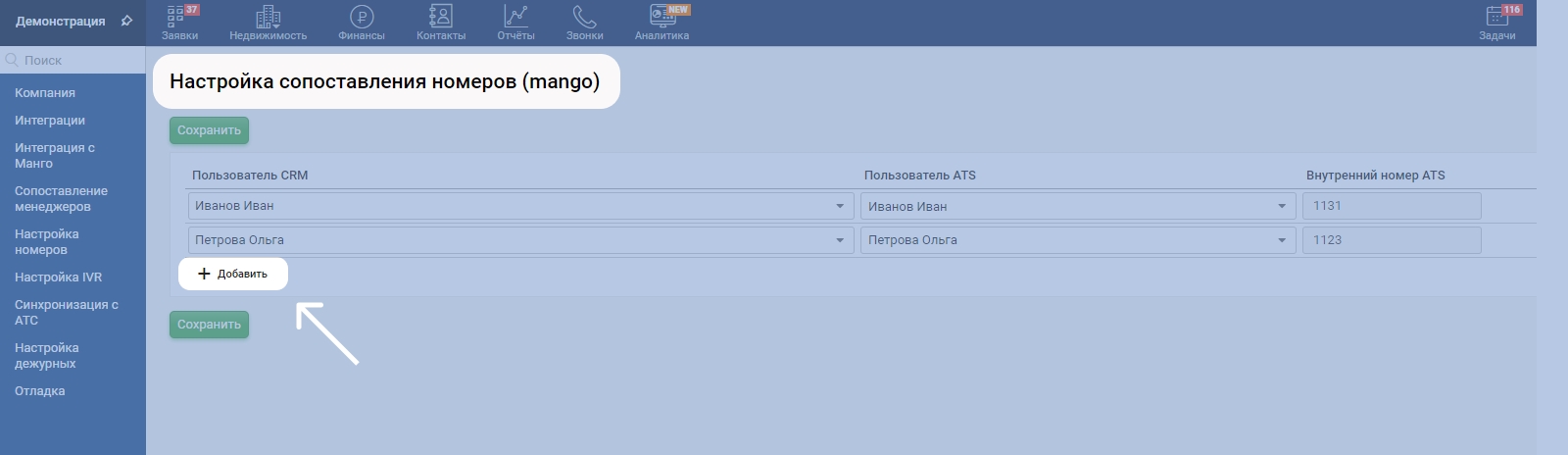 Для добавления менеджера нажмите +Добавить. В появившейся строке слева выберите менеджера в CRM, справа пропишите его внутренний номер. Сохраните настройки.