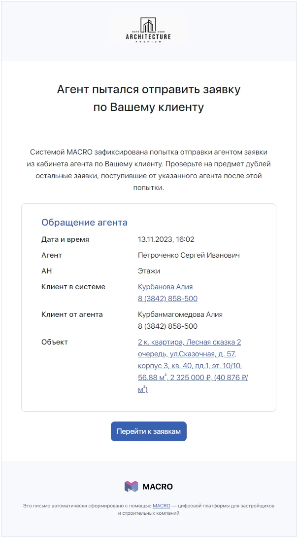 MACRO предупредит (письмом и уведомлением внутри системы) менеджера активной клиентской заявки о каждой попытке подачи агентской заявки по его клиенту.