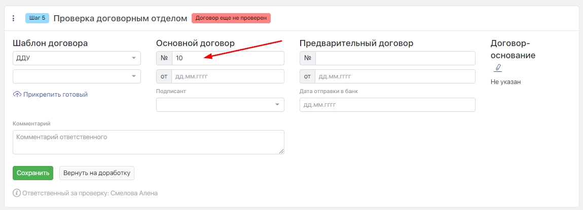 При переводе следующей заявки в сделку указанный номер договора автоматически установится в Шаге 5 сделки: