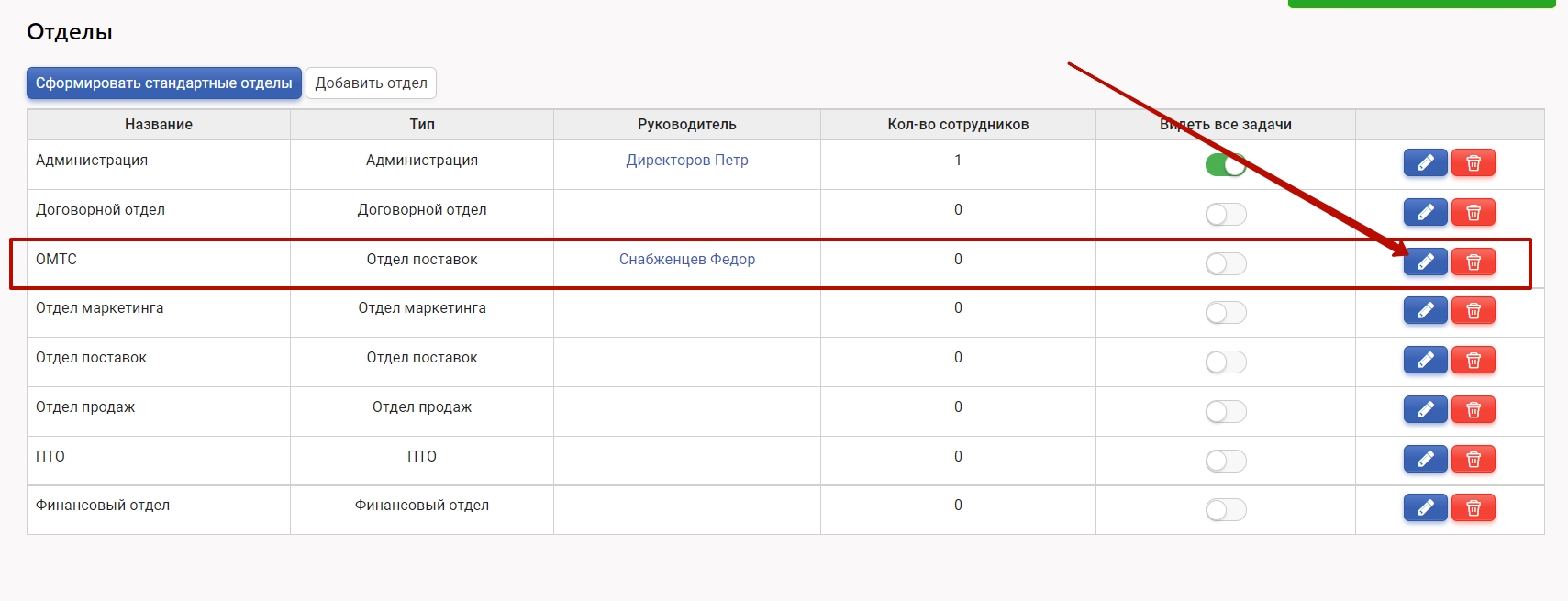4. Чтобы отредактировать имеющийся отдел - нажмите на инструмент "Редактирование"