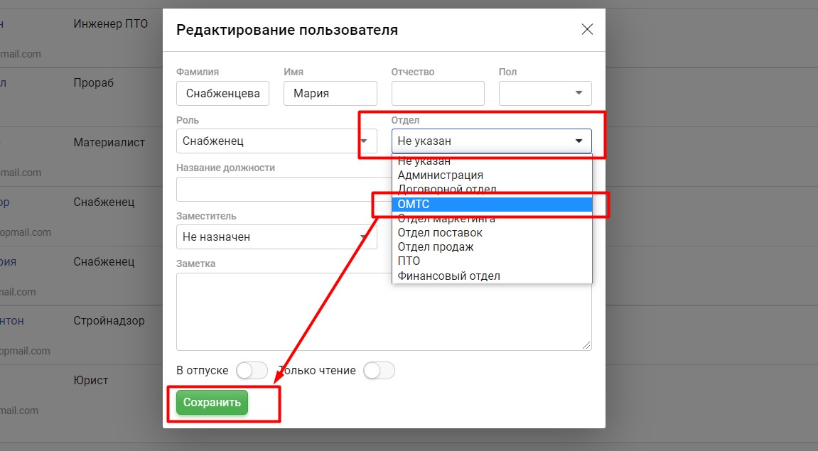 6. В карточке сотрудника выберите необходимый отдел и нажмите "Сохранить"