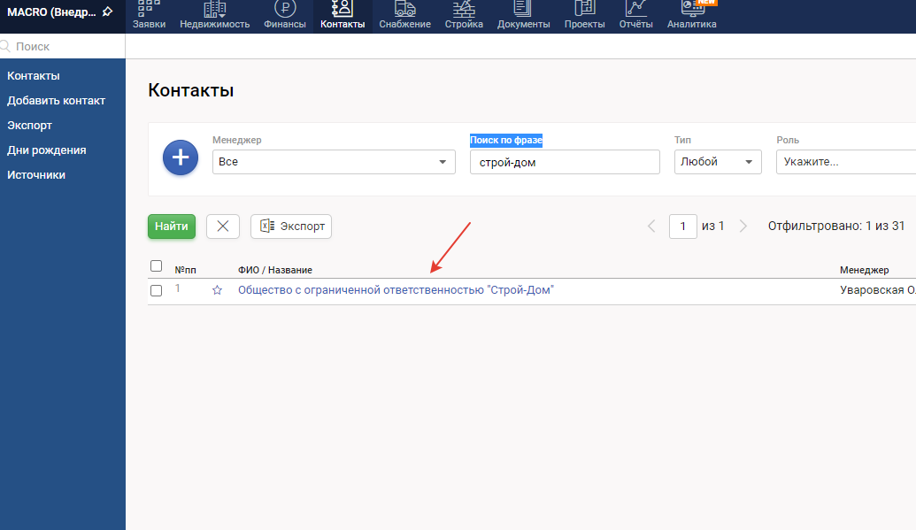1. Переходим в модуль Контакты и в строке "Поиск по фразе" вводим название контрагента.
