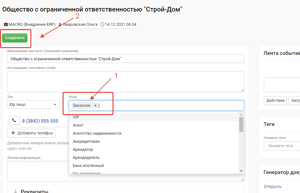 3. В поле Роли выбираем "Заказчик" и нажимаем "Сохранить".