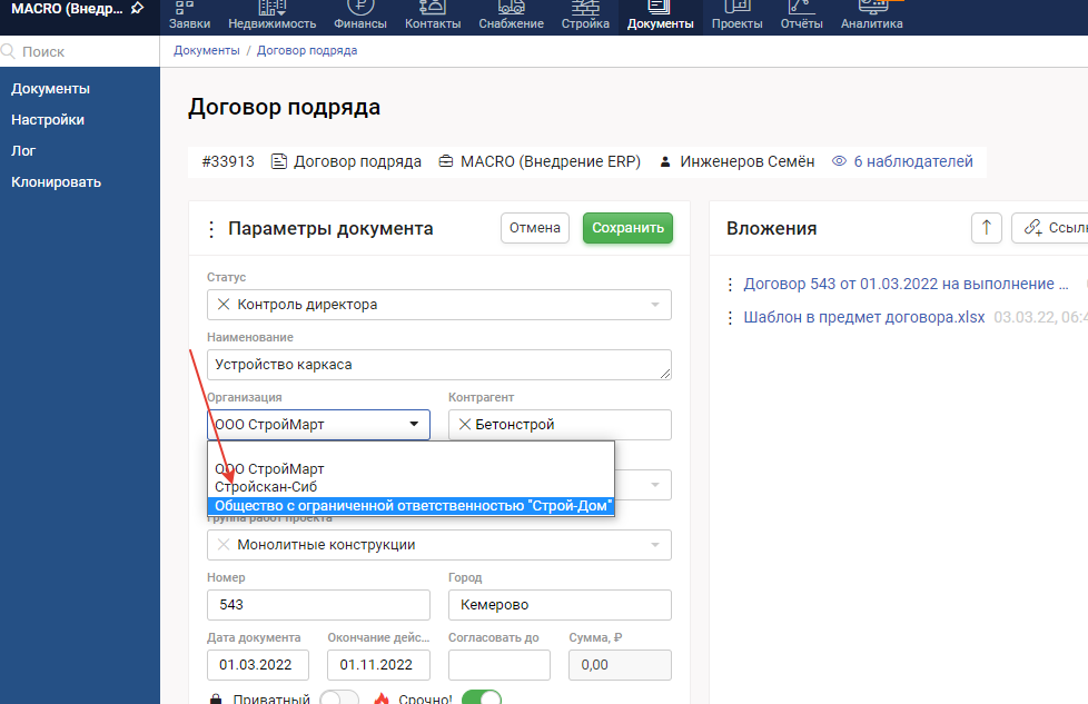 4. Теперь вы можете выбрать данный контакт в качестве Заказчика. Пример: