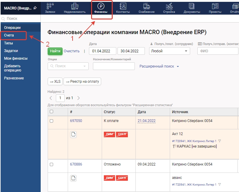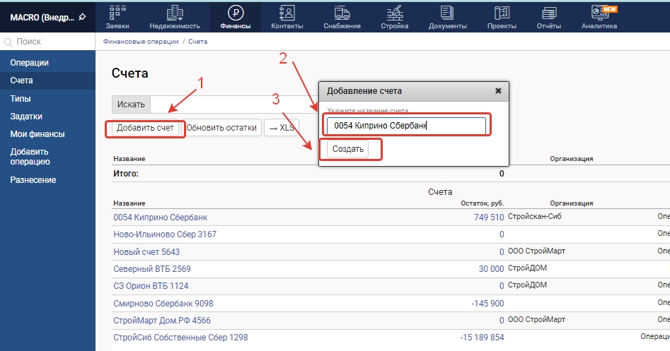 1. Для создания нового расчетного счета перейдите в модуль Финансы и в меню слева выберите вкладку Счета