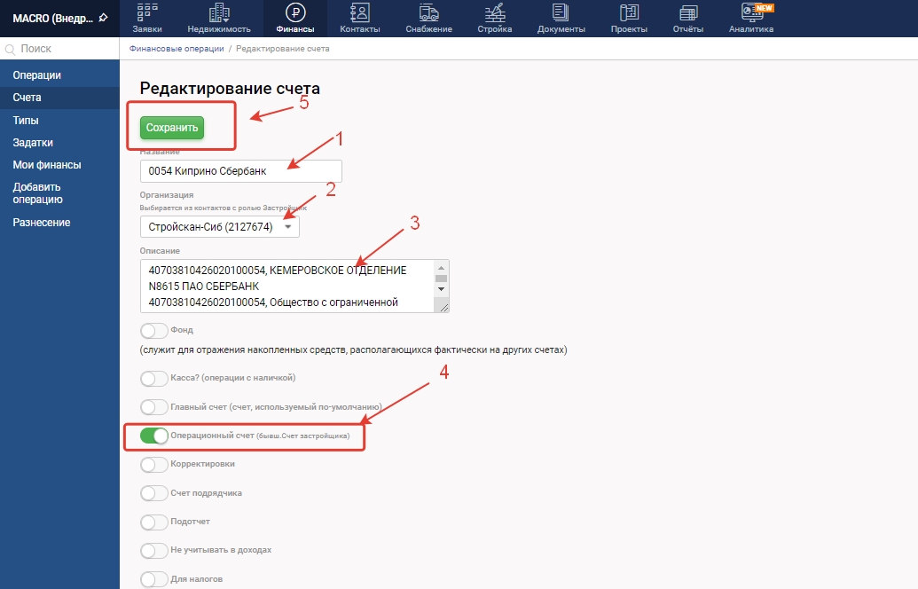 3.4 Выставите тип "Операционный счет" (без данной настройки информация не будет попадать в отчет БДДС)